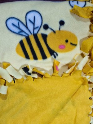 Adorable Bee Double Thick Fleece Tie Blanket! This blanket is handmade, with a light yellow bee pattern on one side and your choice of either black or white fabric on the back.