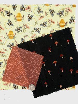 | Design and sizes | Honeybees with Hives and Hexagon Pattern – 2 Large, Mushrooms with Flowers and Orange with Polka Dots – 2 Large, Bumblebees with Hexagons and Pink with Polka Dots – 2 Large, Honeybees with Hives, Hexagon Pattern, and Black with Polka Dots – 3 Pack, Mushrooms with Flowers, Orange with Polka Dots, and Hexagon Pattern – 3 Pack, Bumblebees with Hexagons, Mushrooms with Polka Dots, and Pink with Polka Dots – 3 Pack, Honeybees with Hives 1 XL Square, Bumblebees with Hexagons 1 XL Square, Mushrooms with Flowes 1 XL Square, Hexagon Pattern 1 XL Square, Green Flowers with Bees 1 XL Square, Green Flowers with Bees and Silver Flowers – 2 Large, Green Flowers with Bees, Silver Flowers, and White Leaf Pattern – 3 Pack, Garden with Moth, Denim Pattern, and Yellow Jacquard – 3 Pack |