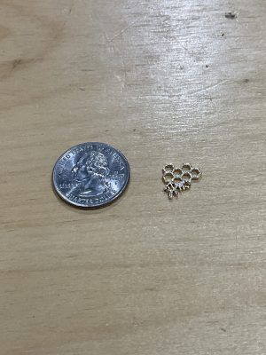 This charm comes in two sizes and colors. The Medium size, which is completely silver, has a length of 0.5 inches. The Small, which is completely gold has a length of 0.25 inches. Both are in the shape of a honeycomb and only the Medium size has a small bee hanging from the bottom.