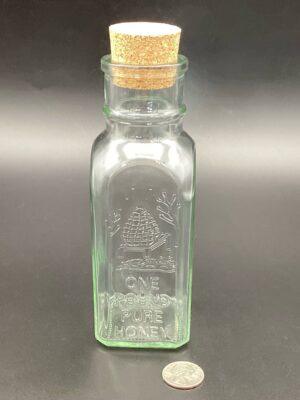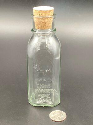A decorative square glass bottle that brings a touch of history and beauty to your honey sales. These bottles were first developed by Charles Muth of Cincinnati in the early 1880s and have not changed much since. Each bottle comes with embossed print stating Honey, a skep, and the size of the bottle. They are sealed with a cork (included in the price).