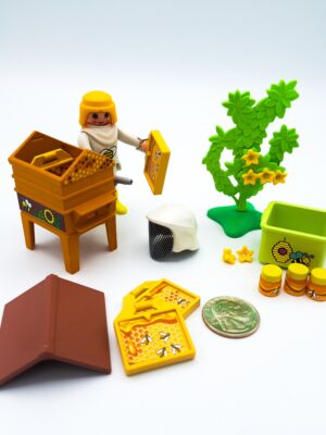 This 3 inch tall beekeeper comes with everything you need for a mini apairy! A hive with a removable hive top has 4 removable frames. The beekeeper has removable veil, gloves, and a smoker to help work in the hive. A bucket will hold the frames or the 3 jars of honey. To finish off the perfect apiary, there is also a small tree with flowers and a butterfly. Comes in factory packaging.
