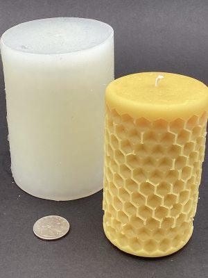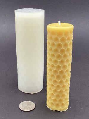 This solid pillar wax mold creates a gorgeous impression of the honeycomb hexagon pattern. Choose between a Tall Pillar ( candle size 5 inch tall 1 3/8 inch diameter) or Short Pillar (candle size 1 1/5 inch tall 1 7/8 inch diameter) or Large Pillar ( candle size 4 1/4 tall 3 1/2 inch diameter). *CANDLE NOT INCLUDED*