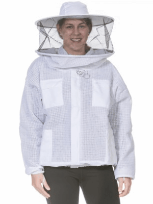 A dual layer mesh jacket with mesh foam between the layers. It comes with zip on hat and round veil, this jacket will keep you happy in the hot summer months. Wrist cuffs feature elastic thumb straps and elastic cuff. Heavy duty zipper with large pull tab so easy to maneuver with your gloves on. Two front pockets made from fabric and a fabric breast pocket with velcro closure. With solid fabric clothing, a bee can get her stinger caught, releasing the alarm pheromone and ending her life. With mesh, they cannot sting and the bees can continue to bee beneficial to the hive after you finish your inspection. This is our daily attire when working a typical hive. If we get into a non typical situation, then we will suit up.