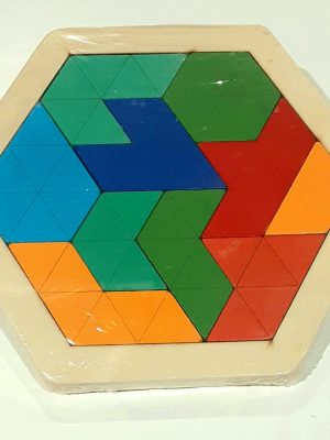 These classic tangram are nestled inside a hexagon to make them even more fun! Made of wood.