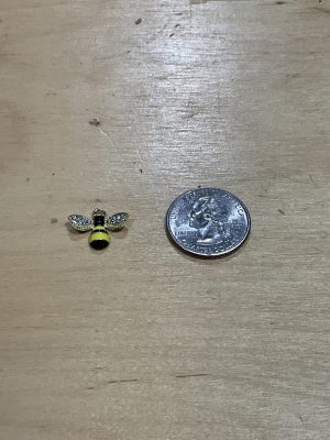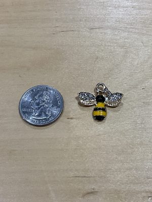 This bee charm comes in four sizes, Mini, Small, Medium, and Large. All sizes are yellow and black striped and come with diamond encrusted wings. The sizes range from 0.25 inches to approx. 1 inch.